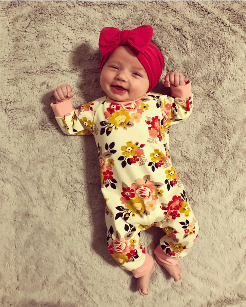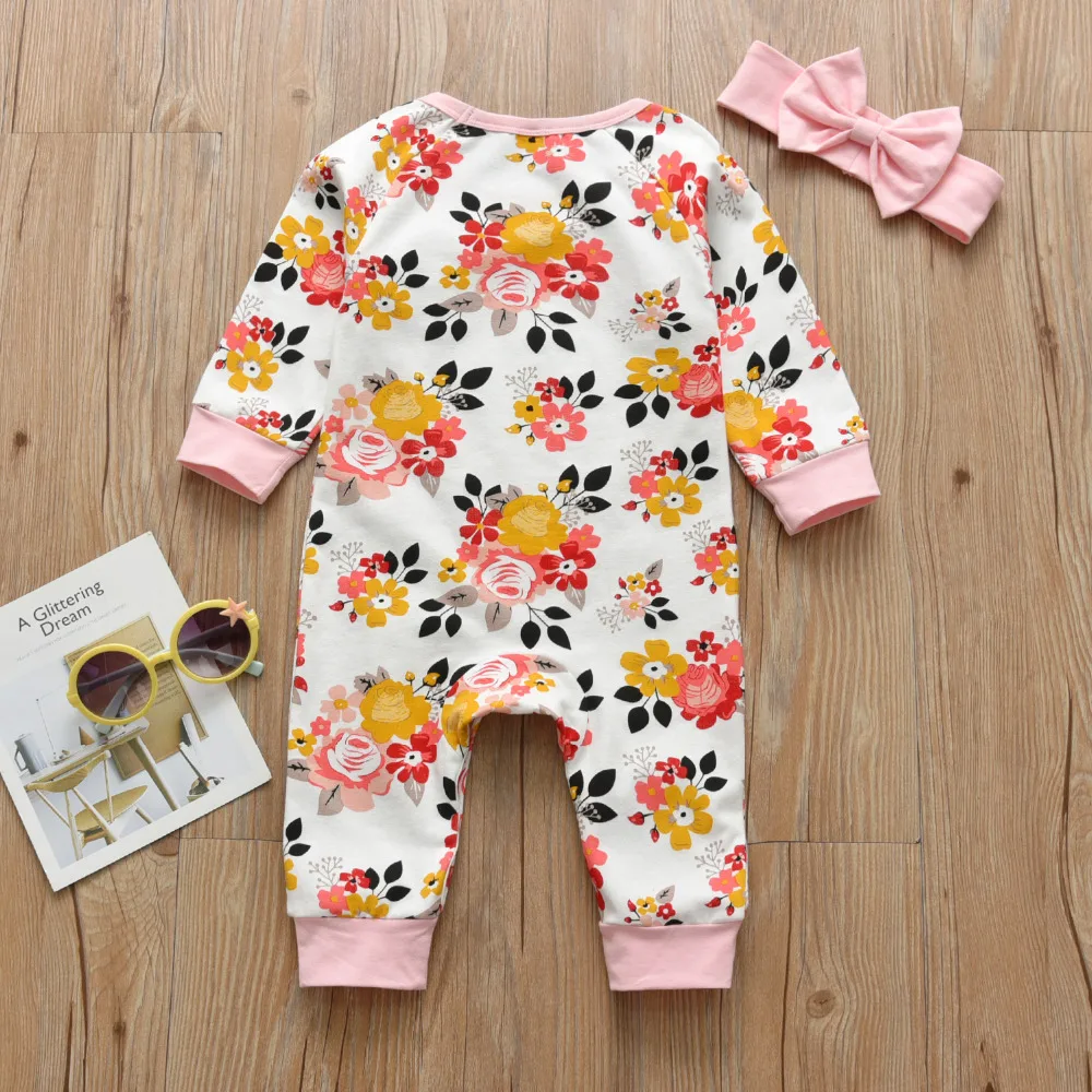 Newborn Baby Girls Romper Casual Floral Cotton Long Sleeve Jumpsuit+Bow Headband Infant 2Pcs Autumn Baby Clothes